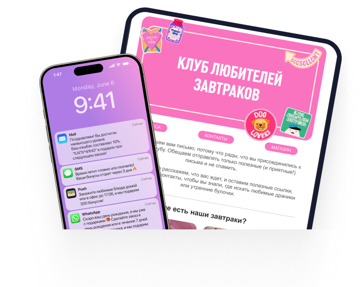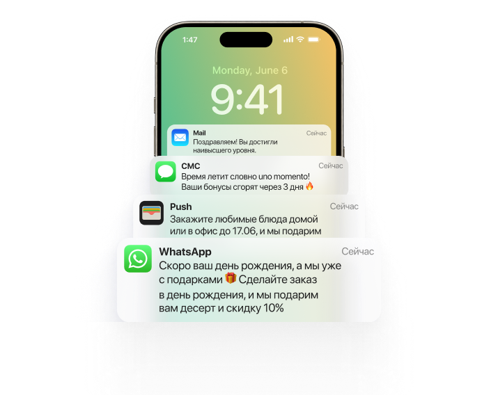 Push, Telegram bot, WhatsApp, email и СМС — все каналы в одной системе. Автоматические и ручные рассылки помогают возвращать гостей, повышать средний чек и строить лояльность.